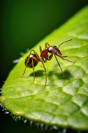 A bright red ant navigates a moist leaf adorned with glistening droplets, showcasing incredible detail.