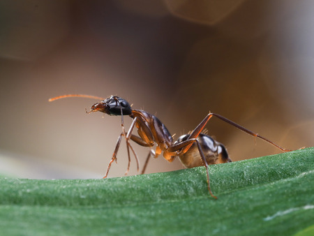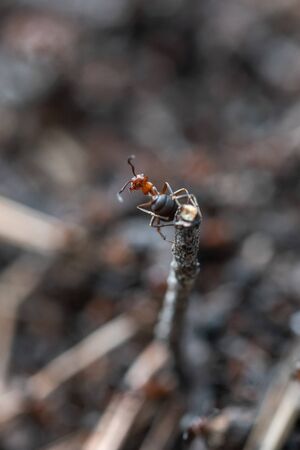Red ant is very small. Selective focus, free space for text.