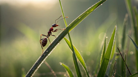 Ant on the grass in the morning. Ant in the nature.