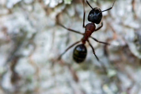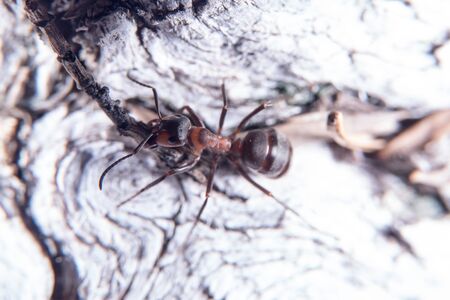 Red ant (Formica rufa) walking on bark on a sunny day