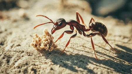 Macro shot of an ant carrying a small piece of food back to its colony, with a focus on its legs and antennae. Natural outdoor setting.