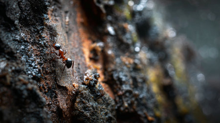 A solitary ant navigates the textured surface of tree bark in a damp environment, showcasing the beauty and complexity of wilderness life in vivid detail.