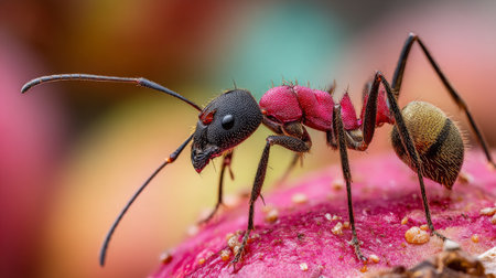 This striking close-up image showcases a vibrant pink ant against a softly blurred background, highlighting intricate details of its body and antennae in natural habitat.