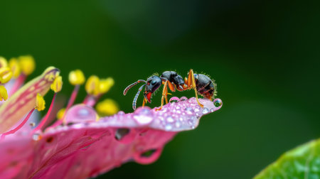 This stunning macro image features an ant delicately perched on a dew-covered petal of a vibrant flower, showcasing the intricate details of nature.