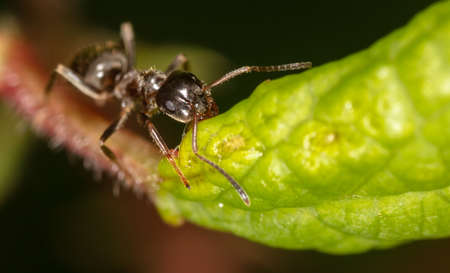 Small black ant isolated on a green leaf drinking water