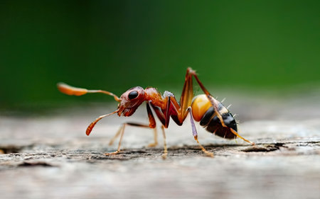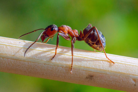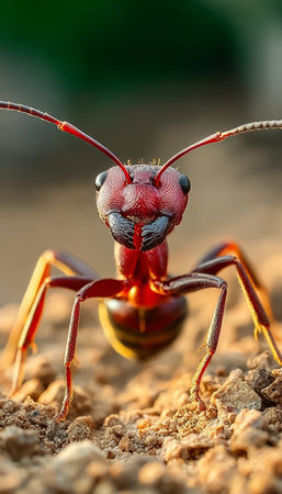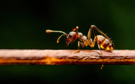 Extreme close up of a red ant exploring its natural environment, showing its intricate features and powerful mandibles