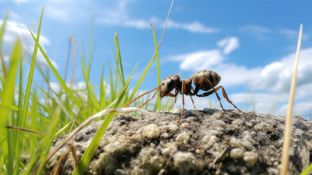 a small ant crawls on a rock amidst lush green grass, against a backdrop of realistic blue skies. the vibrant colors and intricate details, achieved through ray tracing and forced perspective, create a visually stunning scene. the warm tones of orange and brown add depth and a touch of neo-concrete style, while the overall composition exudes a sense of synthetism. ai generated