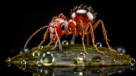 Extreme closeup of a tiny red ant meticulously drinking a large clear water droplet on a textured surface