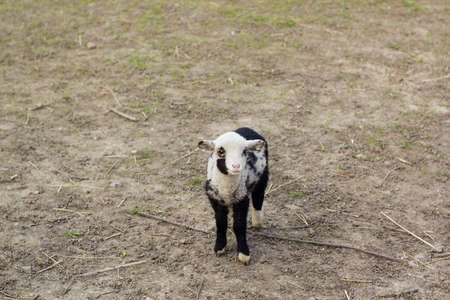 Cute little black and white lamb on farm