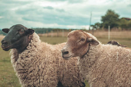 Sheep chewing on grass. Fresh toning. Lamb closeup. Funny cute sheep walk in the pasture. Lambs pose for the camera.