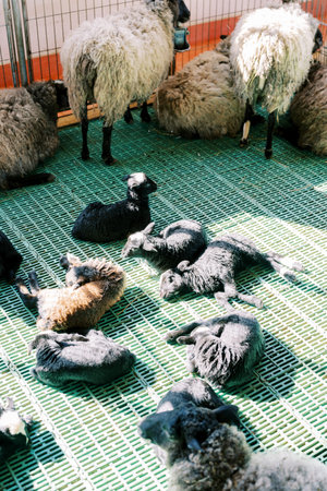 Little black and brown lambs sleep on the floor of the pen near their mother ewes