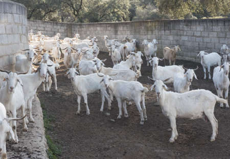 Andalusian white breed dairy goats on farm in holm oak forest fields natural daylights