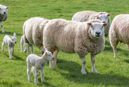 Flock of sheep with newborn lambs in a field on a UK farm