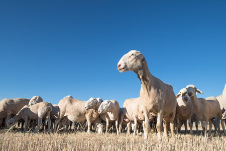 Ile de France sheep flock in pen on livestock farm, domestic animals husbandry concept