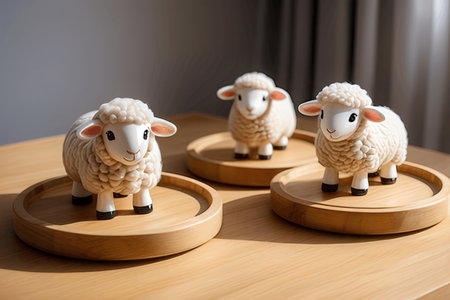 Sheep figurines on a wooden tray. Decorated with natural light.