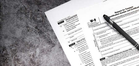 Federal income tax laws W9 form. Pen and spectacles