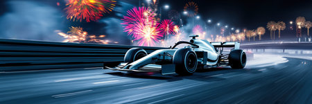 3D rendering of a formula race car on the track with fireworks