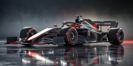 Discover this modern, high performance formula one racing car. Its sleek black and red design and advanced aerodynamic features are beautifully showcased in a dramatic studio setting with reflections.