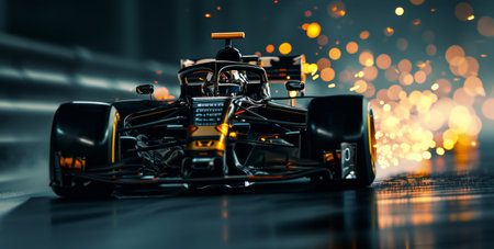Formula 1 Race Car Speeding on Track with Sparks. Motorsport and Technology Concept.