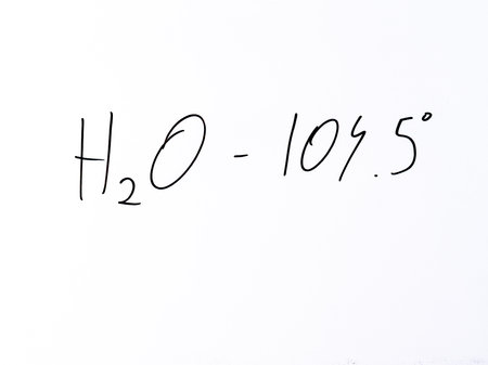 Minimal handwritten note “H₂O – 104.5°†on a white background. Represents the molecular bond angle in a water molecule.