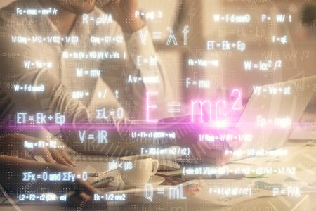 Double exposure of man and woman working together and math formulas hologram drawing. Education concept. Computer background.