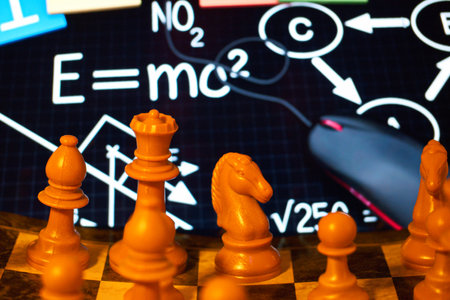 Digital composite of Computer Desk foreground with blackboard graphics of math equations