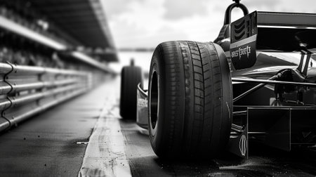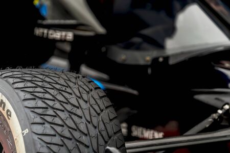 Close-up of racing car's wheel with detailed tire tread on blurred pit lane background
