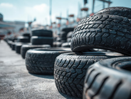 Rows of rugged black tires form a rhythmic pattern on an open surface, with a softened backdrop and bright sunlight highlighting their textured surfaces.