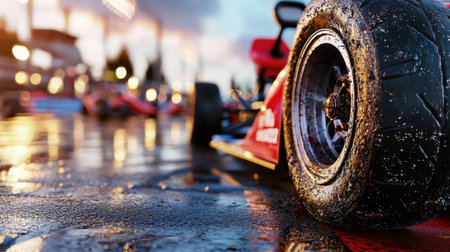 A close up view of Formula 1 car tire on racetrack at sunset, showcasing intricate details and textures