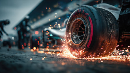 An intense moment captured at a race track where sparks fly from a Formula racing tire during a pit stop, showcasing the thrilling energy of motorsport.