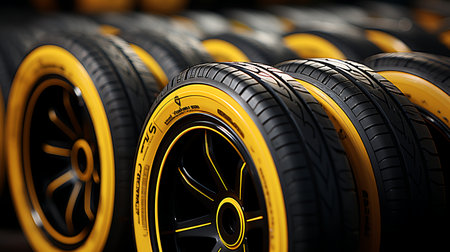 warehouse with workpiece with yellow line of car tires at factory