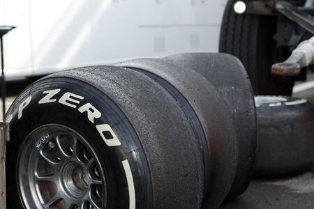 MUGELLO, ITALY - MAY 2012: Pirelli Formula One slick tires on display in the paddock of the Mugello circuit.