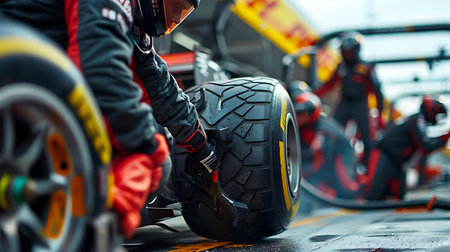 A sharp shot capturing the intense focus of a pit crew during a critical pitstop in a high-stakes race