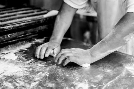hands of the teacher baker in the bread production on the table
