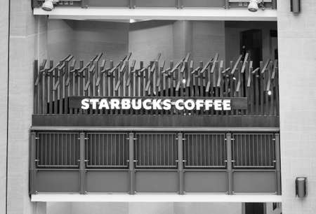 CAMBRIDGE, UK - CIRCA OCTOBER 2018: Starbucks Coffee at Grand Arcade shopping centre in black and white