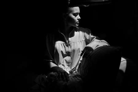 the profile of a young woman in a dark room illuminated by light from the window