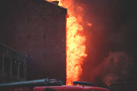 Massive large blaze fire in the city, brick factory building on fire, hell major fire explosion flame blast, with firefighters team firemen on duty, arson, burning house destruction