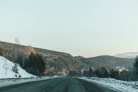 The winding road disappears behind the beautiful juniper tree in the sunny and frosty winter landscape