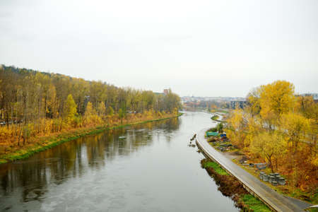 Beautiful autumn view of Neris river winding through Vilnius city. Scenic Lithuanian cityscape.