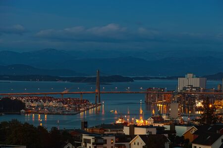 Alesund, Norway. Night View Of Alesund Skyline Cityscape. Historical Center In Summer Evening. Famous Norwegian Landmark And Popular Destination. Alesund, Kiven viewpoint, Mt