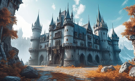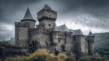 An imposing stone castle stands prominently on a hill, its multiple turrets and towers reaching towards the cloudy sky. The architecture showcases textured stone, varying shades of gray, and a medieval design. The scene suggests a historic setting, possibly day, with potential uses in historical or travel related projects.
