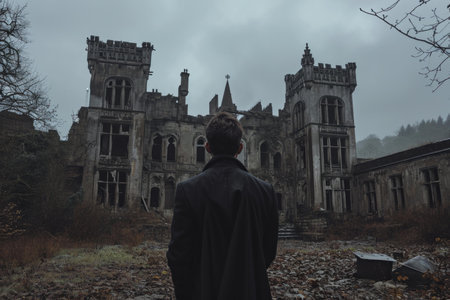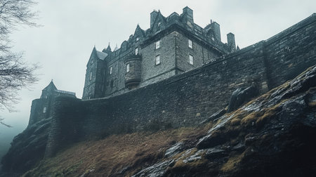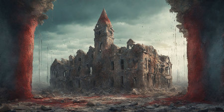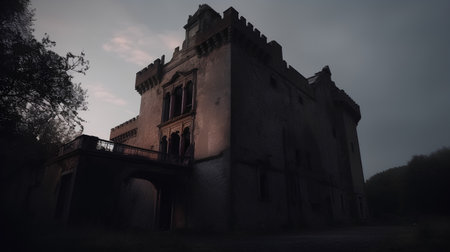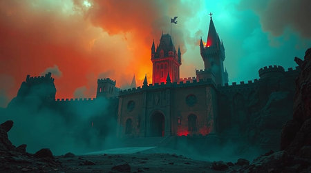 A castle with a foggy sky in the background. The castle is old and abandoned. Scene is eerie and mysterious