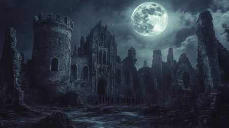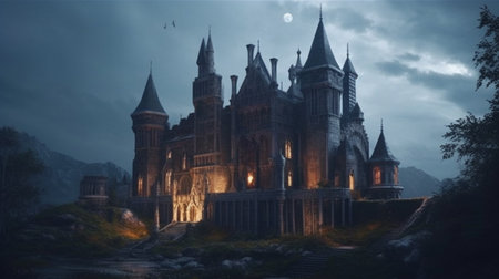 Fantasy fairytale gothic castle on hill in foggy forest over majestic night landscape under full moon. Generative AI