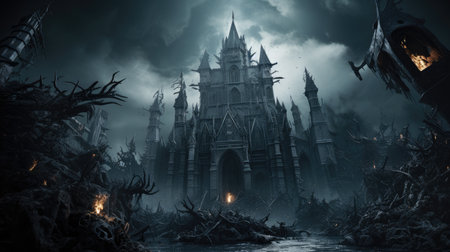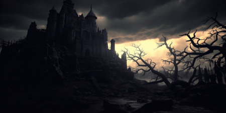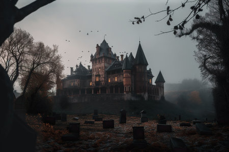 A creepy castle sits in the middle of a graveyard. AI generative.