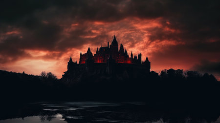 AI Generated. Spooky castle on a rocky hill illuminated by lightning strikes under a haunting stormy sky