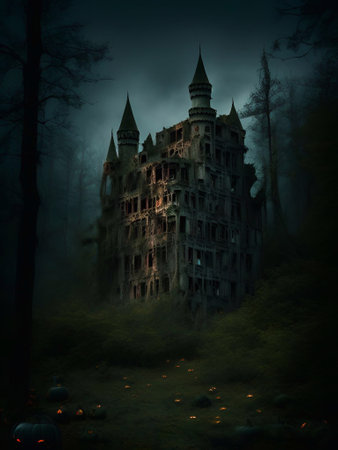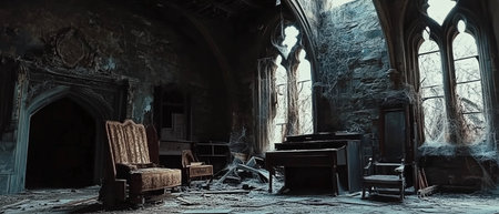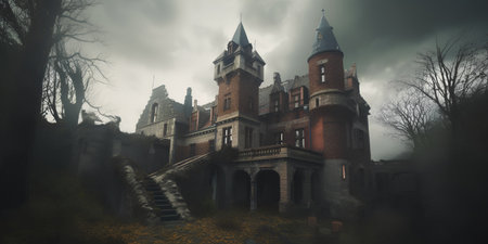 Eerie and creepy atmosphere inside the old building, a haunted mansion with a mysterious history. Generate AI