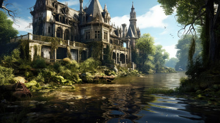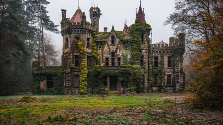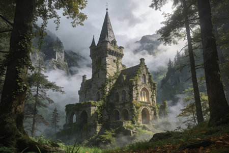An enchanting view of an abandoned castle in a misty forest, showcasing its gothic architecture surrounded by overgrown vegetation, evoking mystery and solitude.