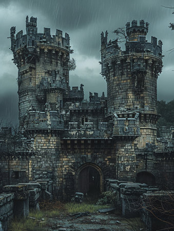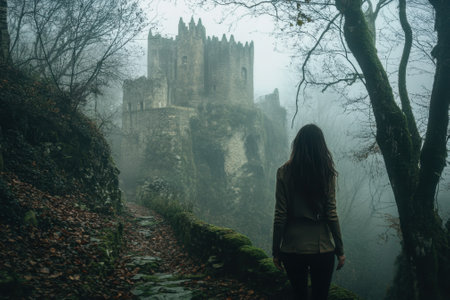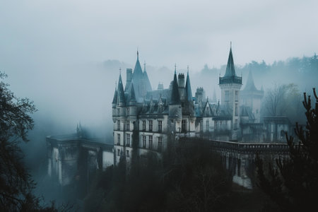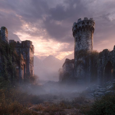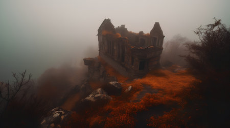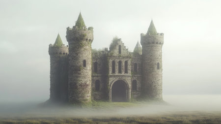 A haunting image of an ancient castle ruins enveloped in fog. The mystical ambiance and weathered stonework create a sense of history and solitude.