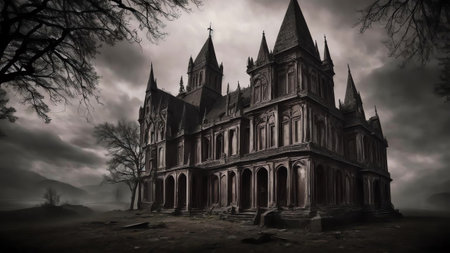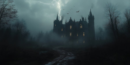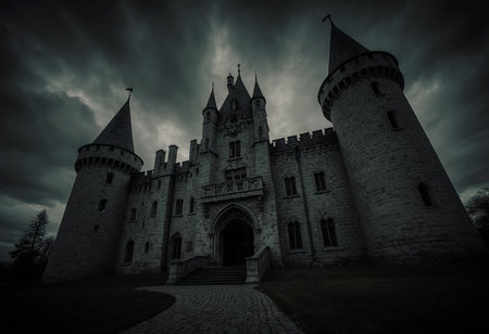 A dark and gothic castle stands tall under a foreboding sky, enhanced by swirling clouds. The structure looks haunting, setting the perfect stage for Halloween.