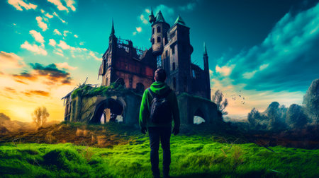 An AI illustration of a man standing atop a rocky cliff overlooking an ancient castle.